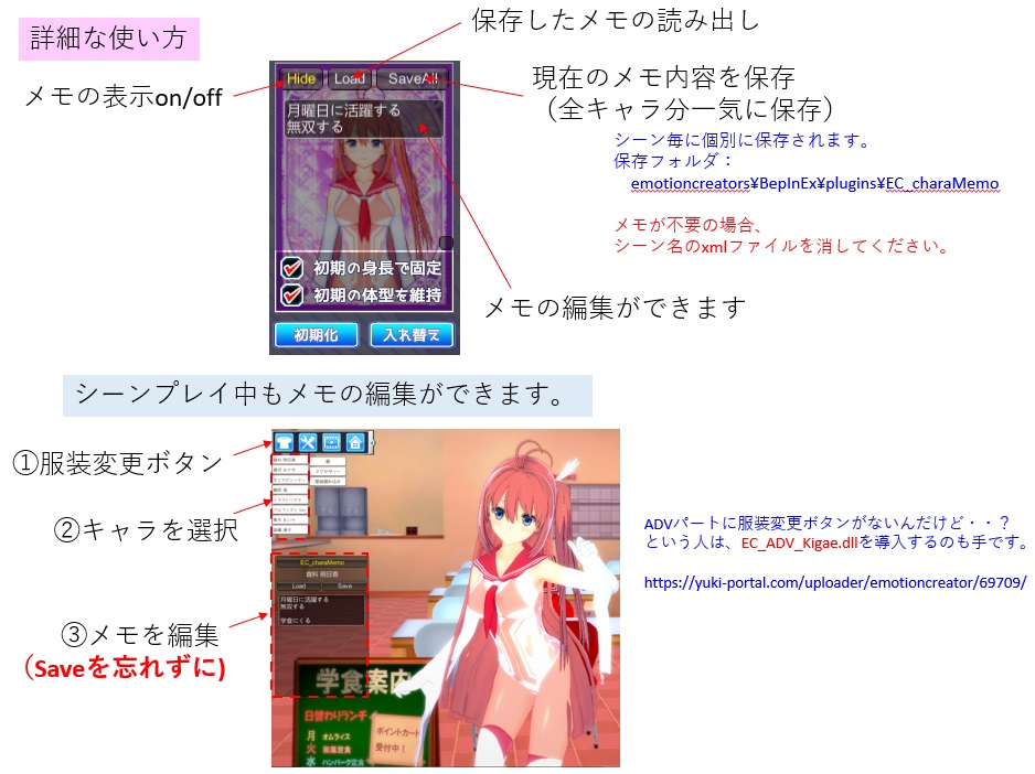 シーンプレイのキャラ変更のときにメモを表示するplugin v0.1 for BepInEx