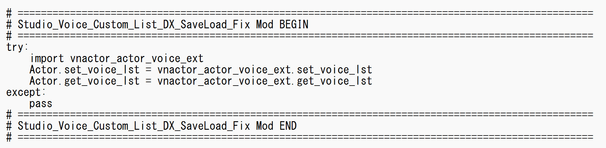 vnactor.py 内の特定の関数を、本パッケージ同梱の ‘vnactor_actor_voice_ext.py’ に定義された関数へ置き換えるために必要なパッチ記述です。