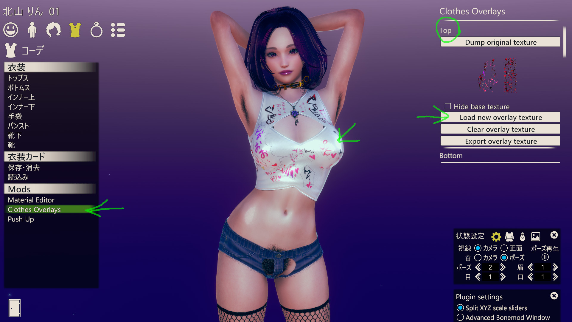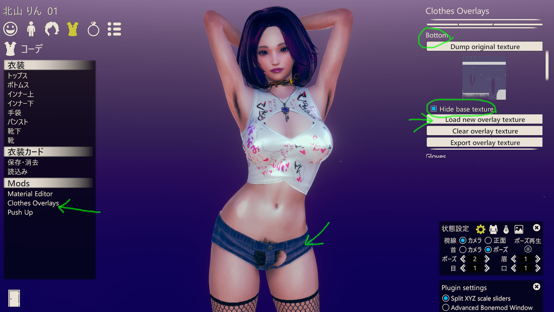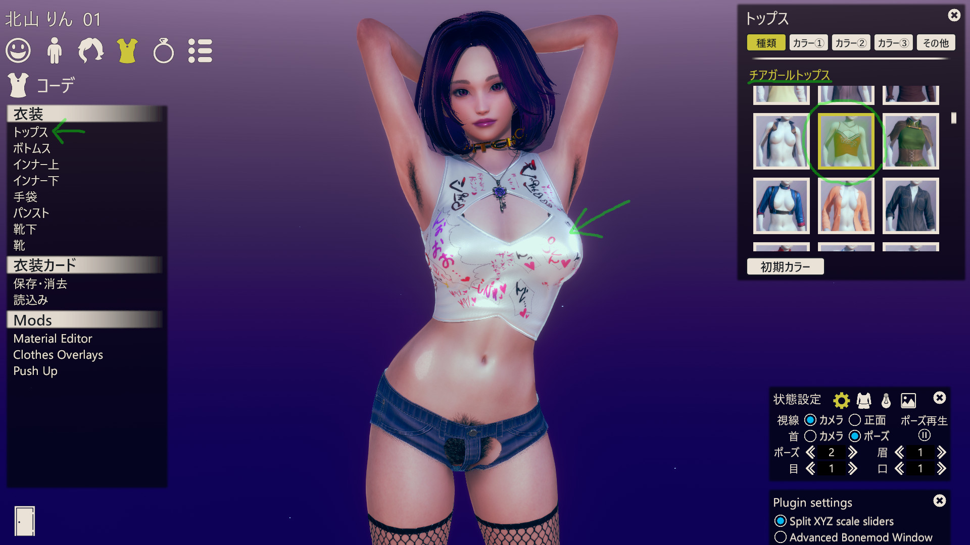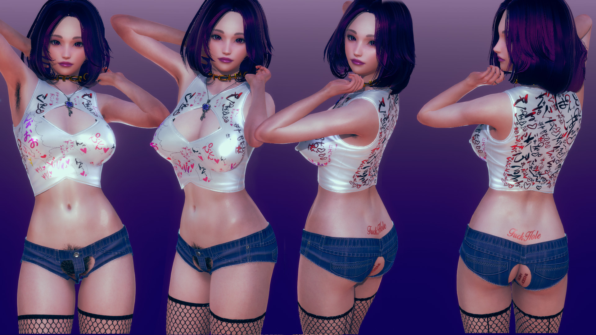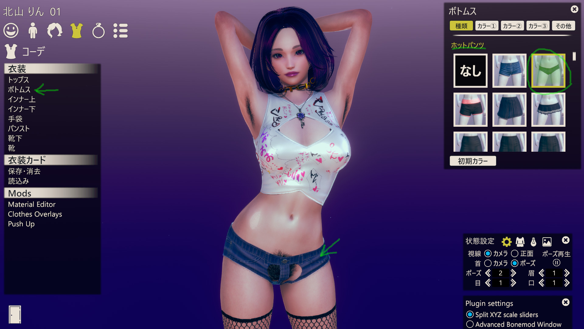 どちらも公式のチアガールトップスとホットパンツをベースにオーバーレイファイルでの改造です。ついでに数か月ぶりに腋毛の新作も付けました。年増の剛毛っぽい縮れ毛。アンダーは以前作ったものを流用。