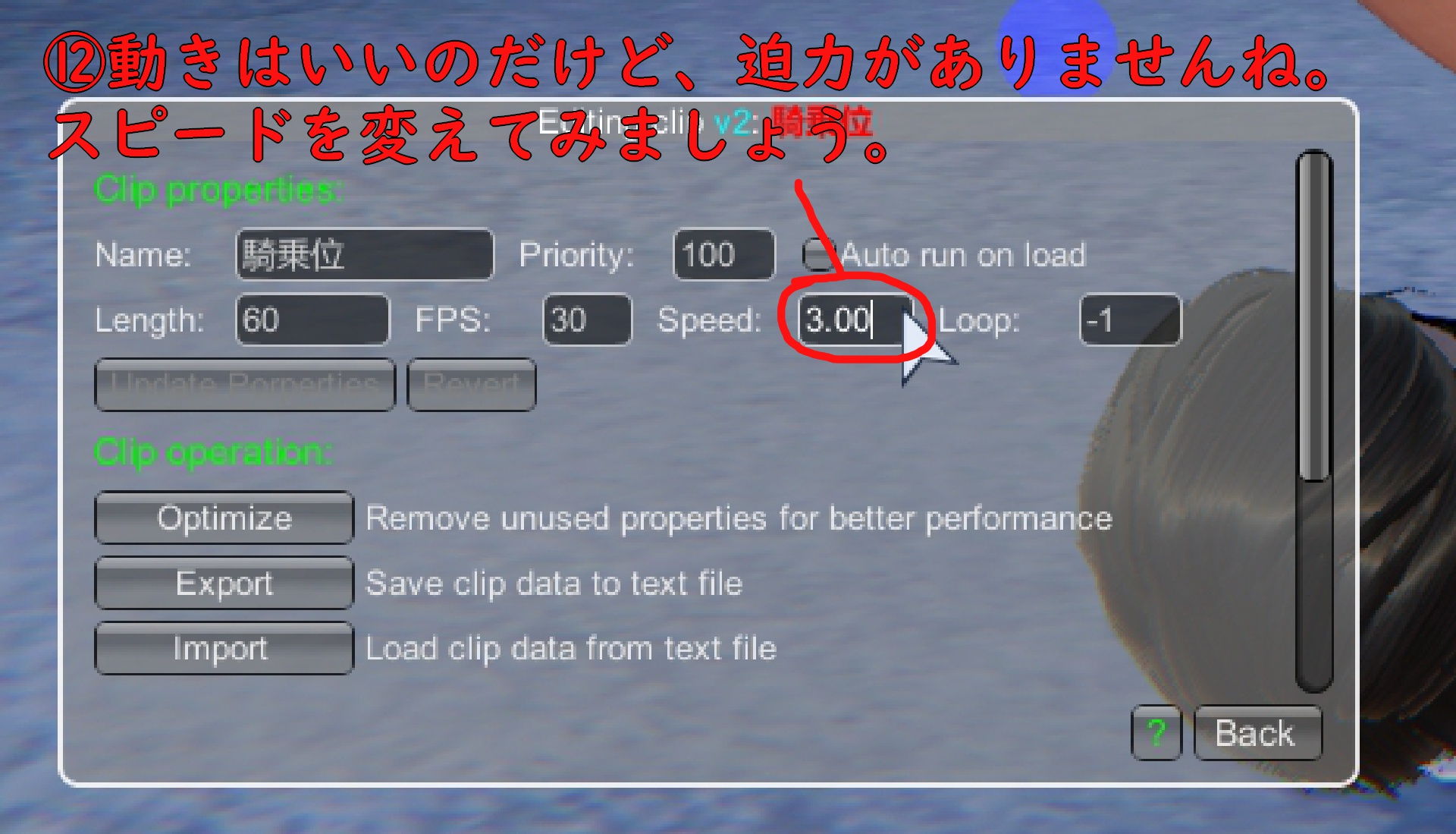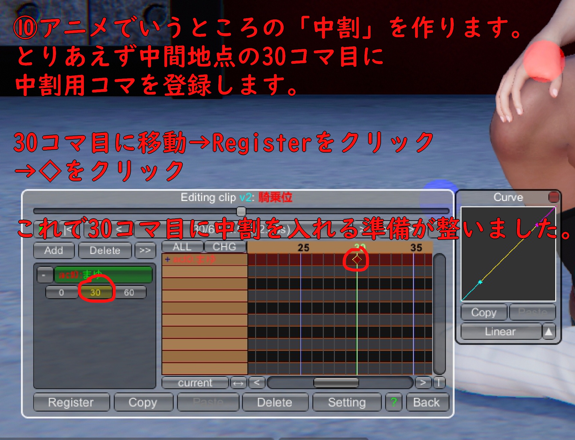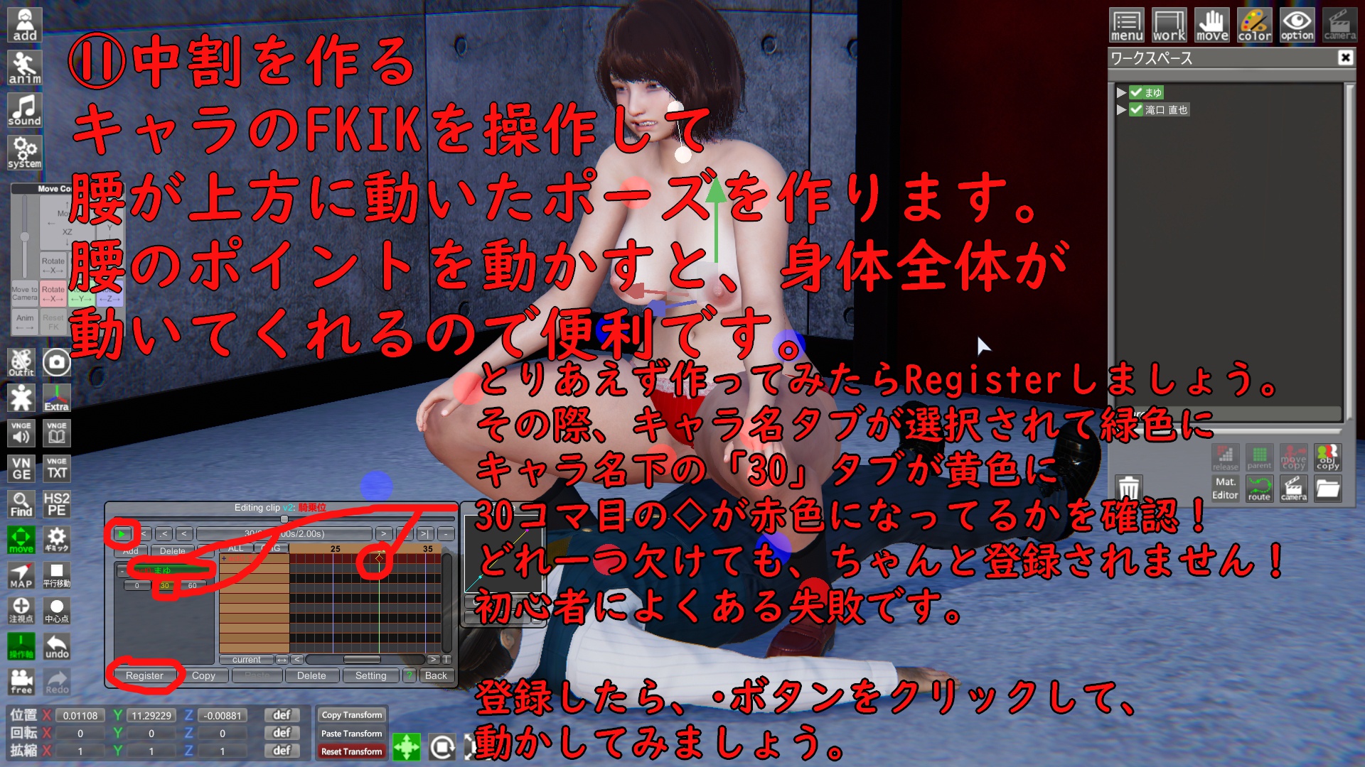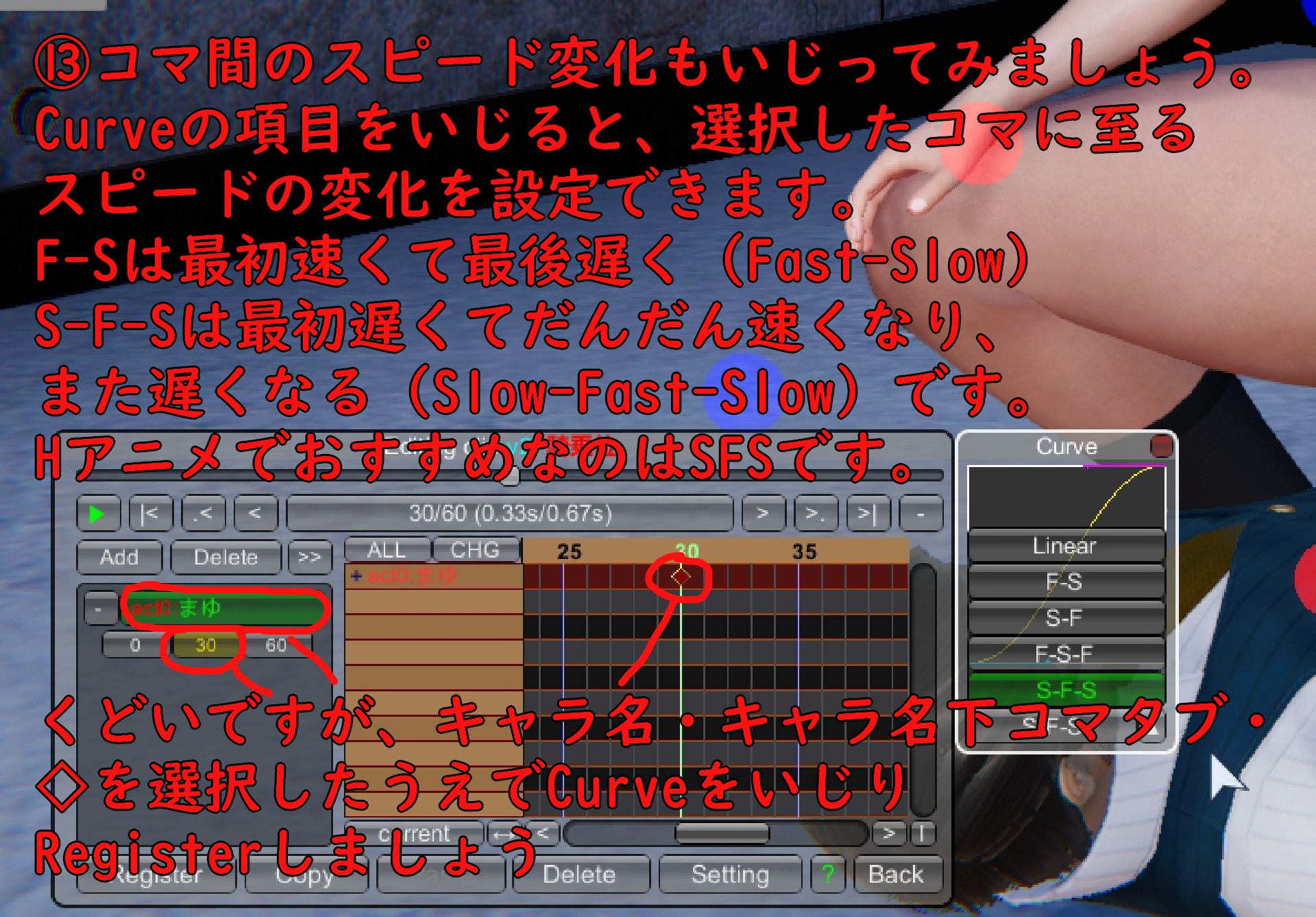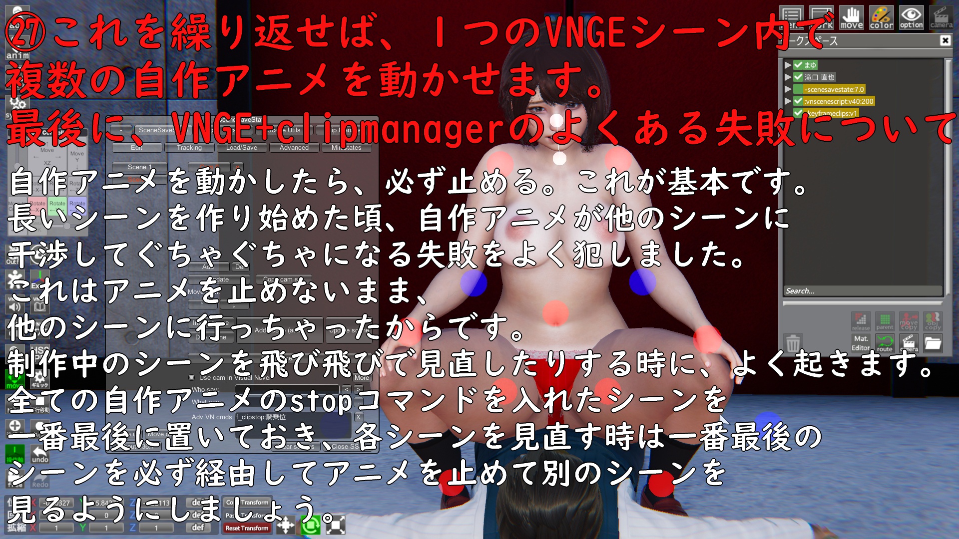 本末転倒ですが、Hアニメを作るだけなら、nodeconstrains+hooh gimmickの方が簡単に作れるし、滑らかに動きます。ただ、VNGEと相性がいいのはclipmanagerの方ですし、なんつーか、node+gimmickが「パズルを作る」感覚なのに対し、clipmanaは人間の動きの研究になるっつーか、アニメ作ってるようでおもしろいのです。