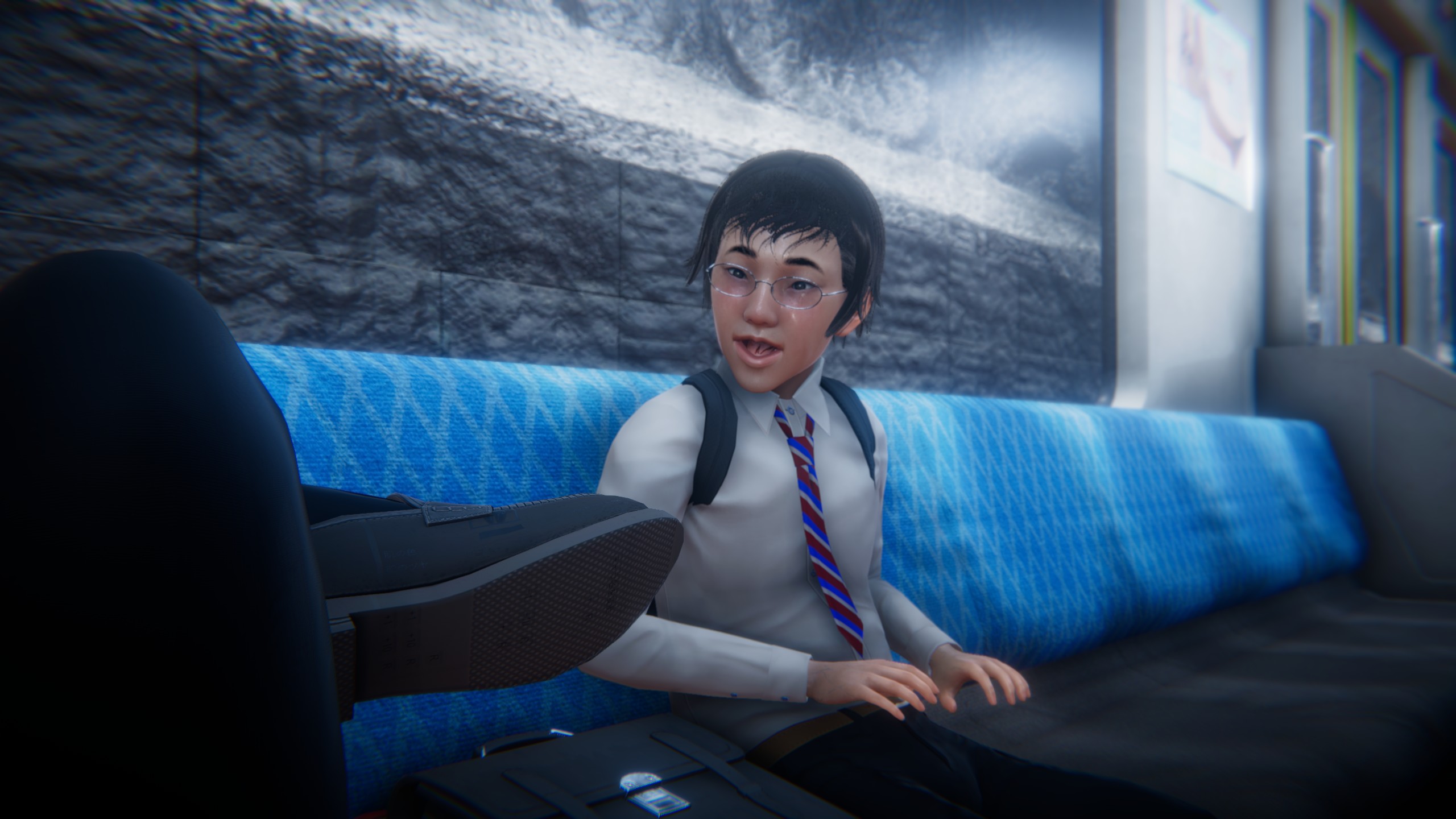 電車で居眠りをする女学生と、いたずらする悪ガキ。