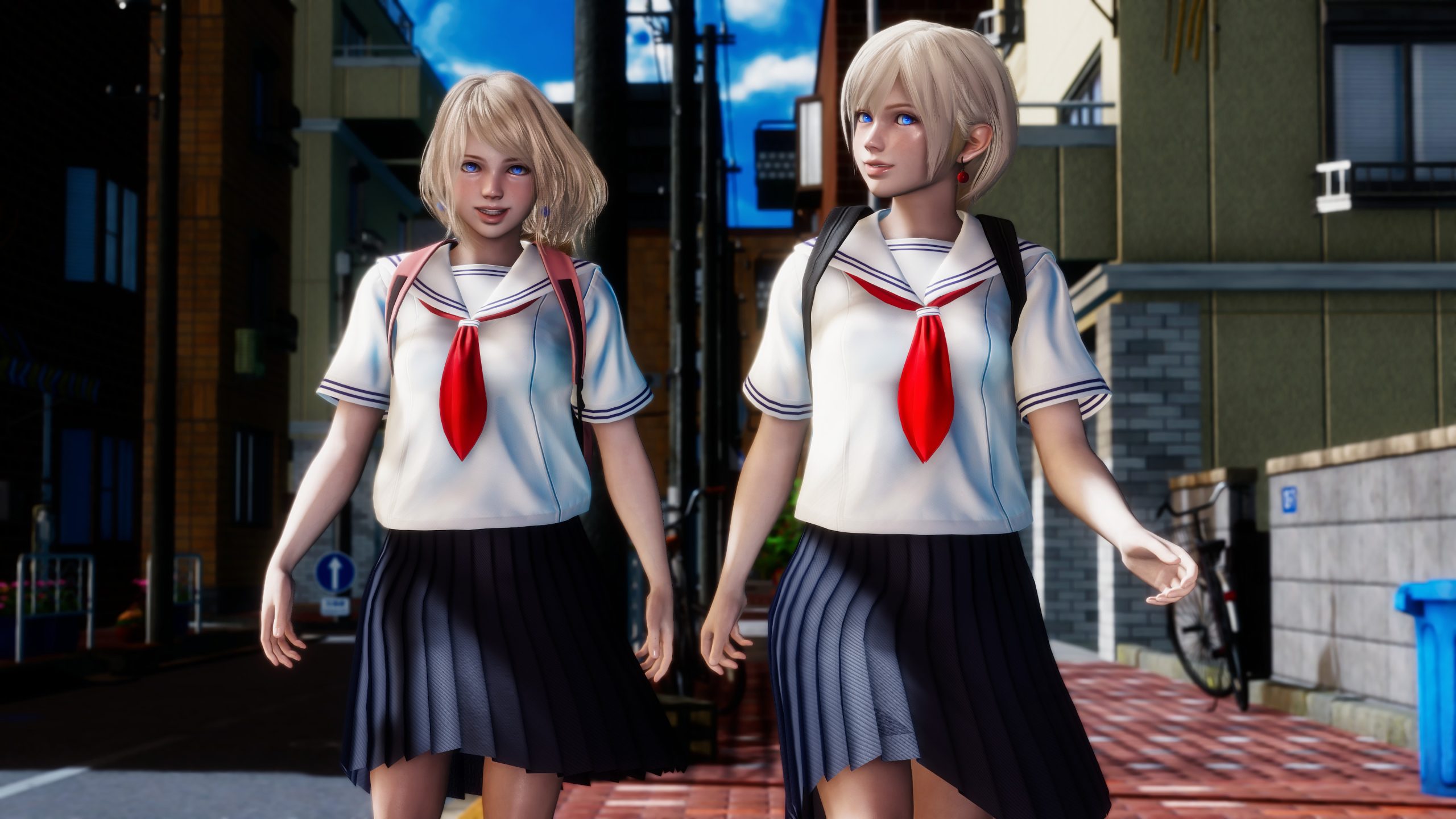 1. セーラー服:貧乳キャラ向きにBumpMapとテクスチャを入れ替え、胸の間や下部分の陰が出ないようにしています。デフォルトだと丈が短く、おなかにピッタリフィットしたデザインなので、腹まわりを大きく調整したダミーキャラをY方向に引き延ばし、InvisibleBodyで身体を透明化して重ねています。