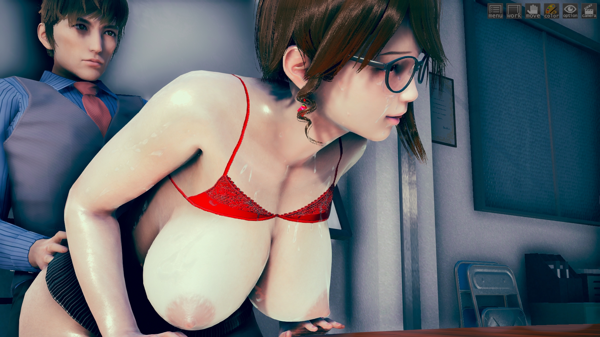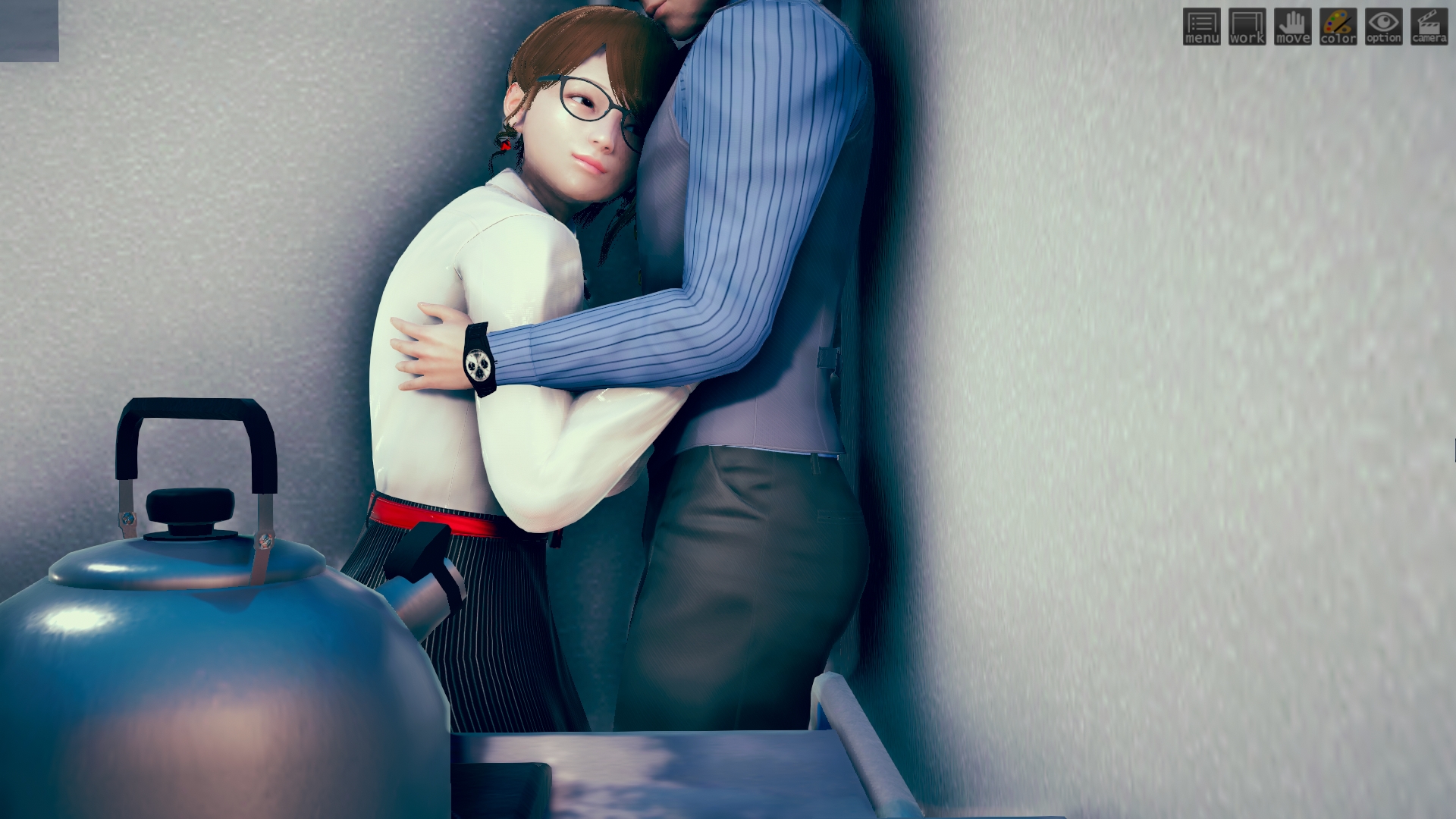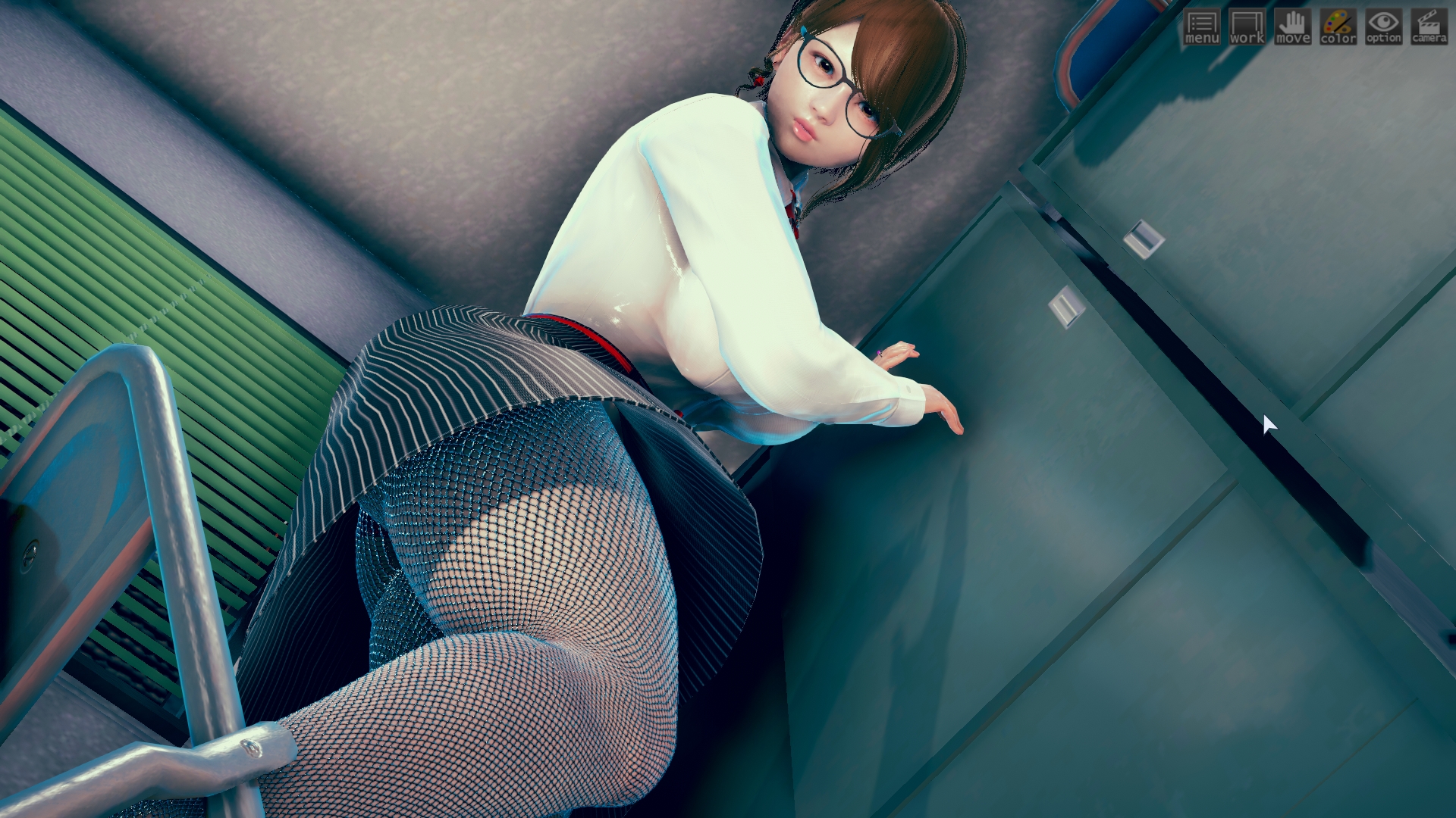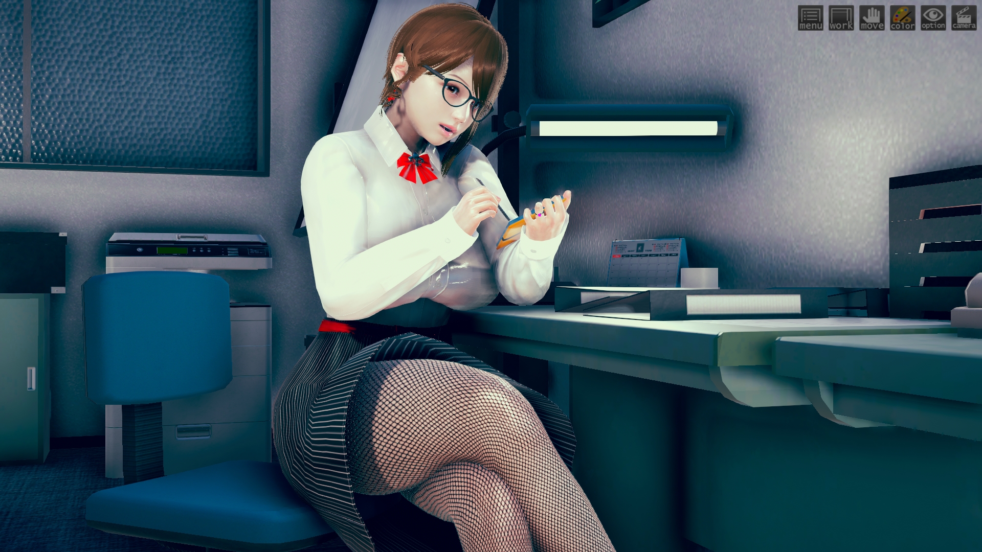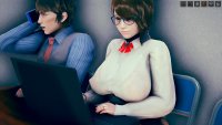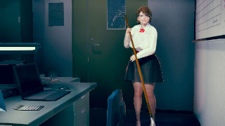最初はhoohさんのlibrary map で作ってたんですけど、どうしてもライティングが決まらなくて。仕方なくオフィス舞台に変更。ファーストシーンで女性が床掃除してるのは、その名残り。このキャラもおれには珍しくオリジナルで、もちろんモデルは元同僚。これも奇跡的に似ていて最高。アイテムカメラなんでHボタン押すだけでサクサク進みます。全10場面でアイテムカメラ20ぐらい。
