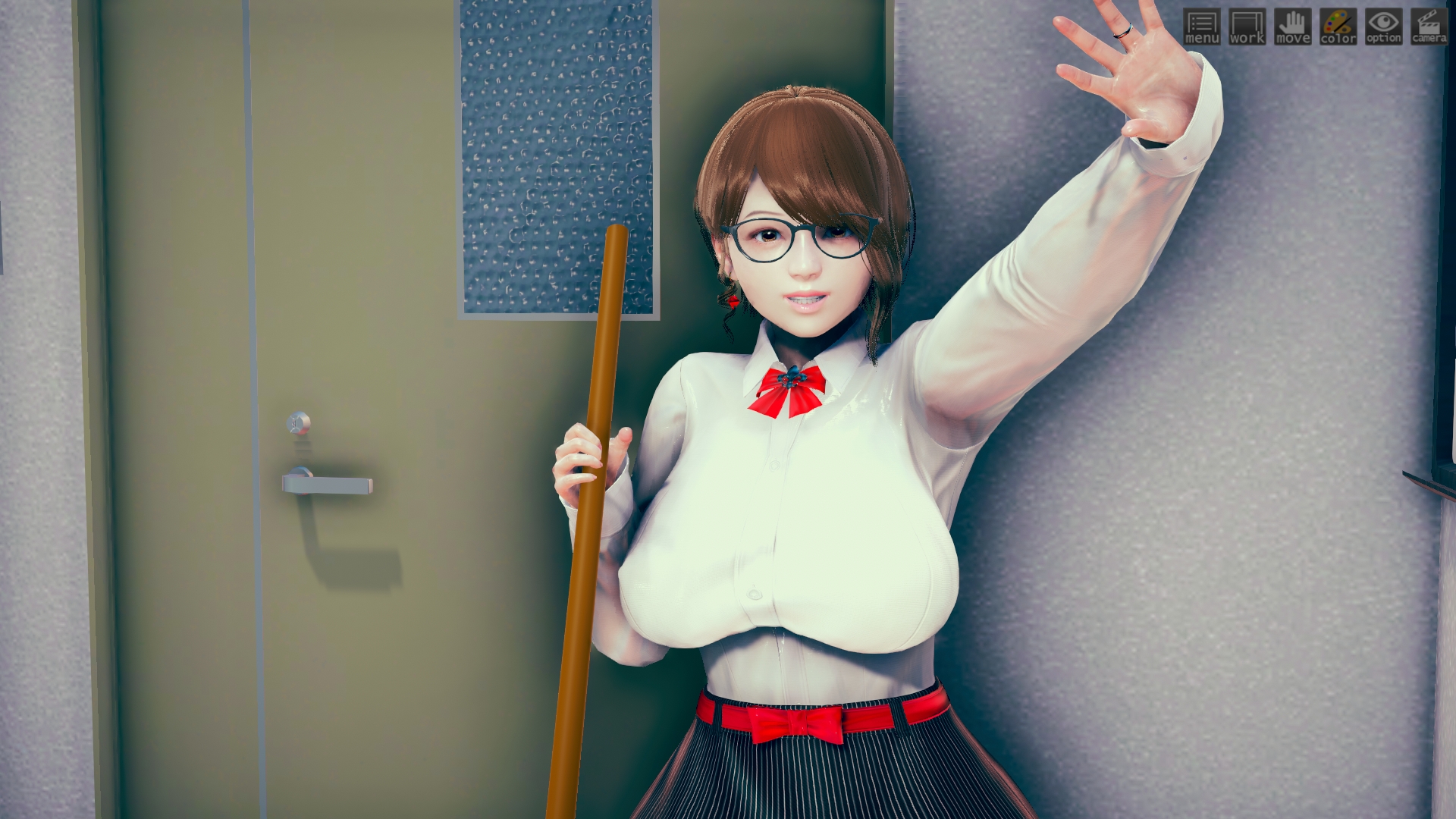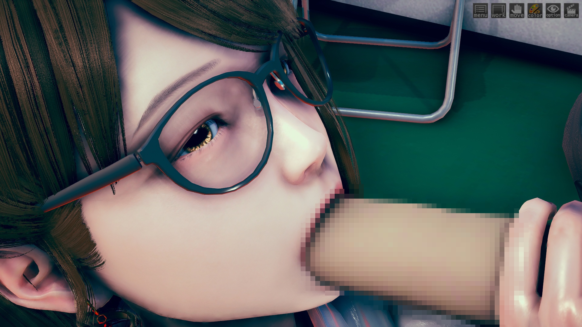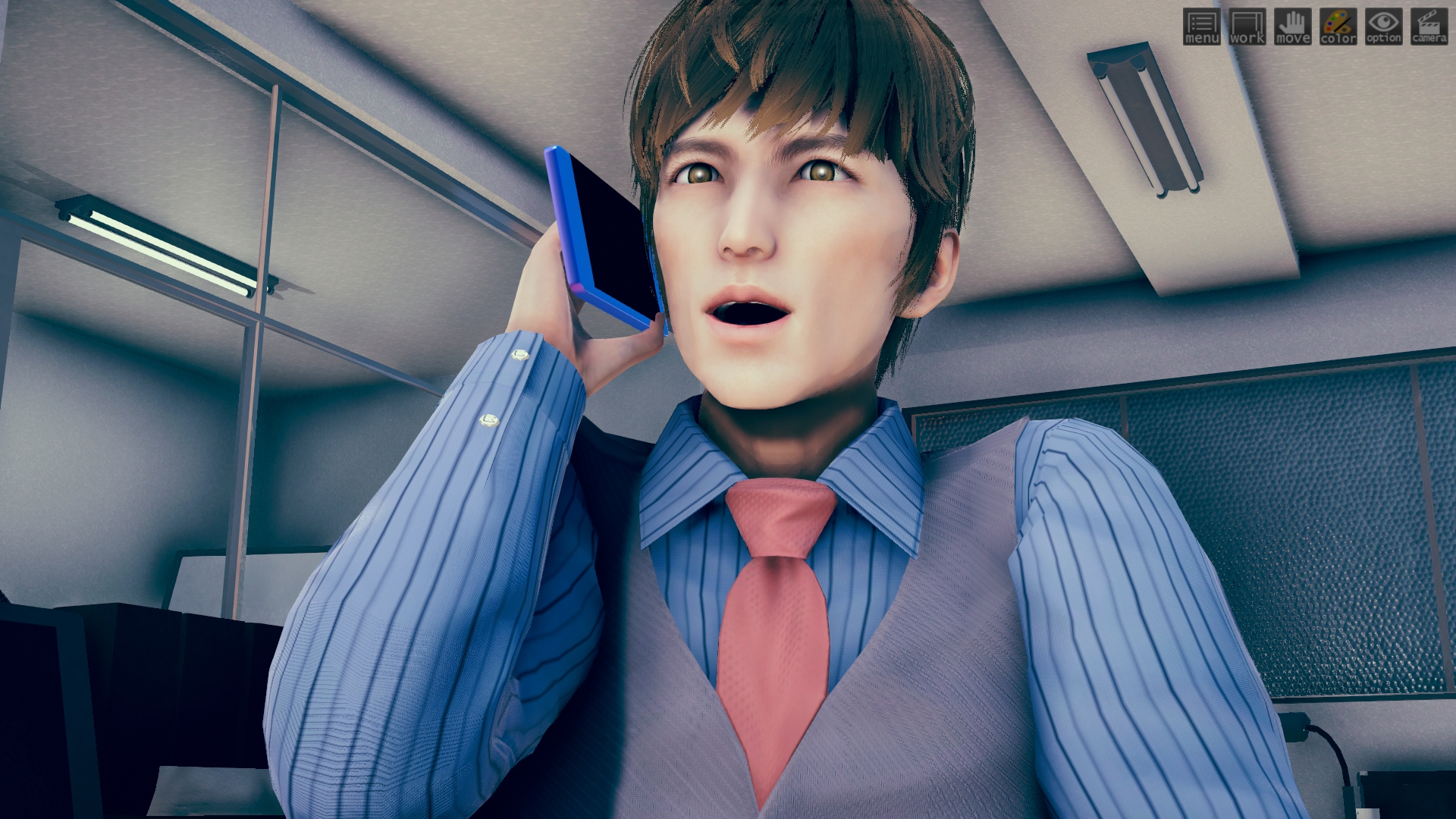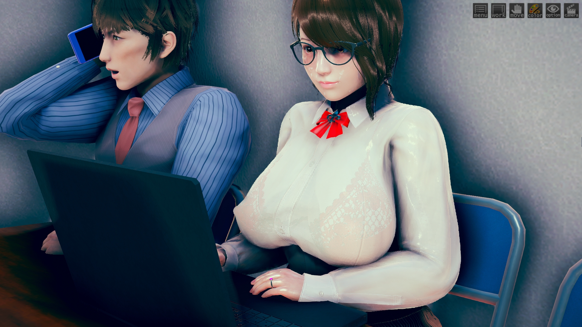 最初はhoohさんのlibrary map で作ってたんですけど、どうしてもライティングが決まらなくて。仕方なくオフィス舞台に変更。ファーストシーンで女性が床掃除してるのは、その名残り。このキャラもおれには珍しくオリジナルで、もちろんモデルは元同僚。これも奇跡的に似ていて最高。アイテムカメラなんでHボタン押すだけでサクサク進みます。全10場面でアイテムカメラ20ぐらい。