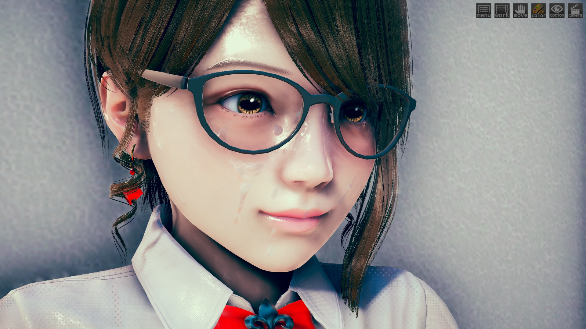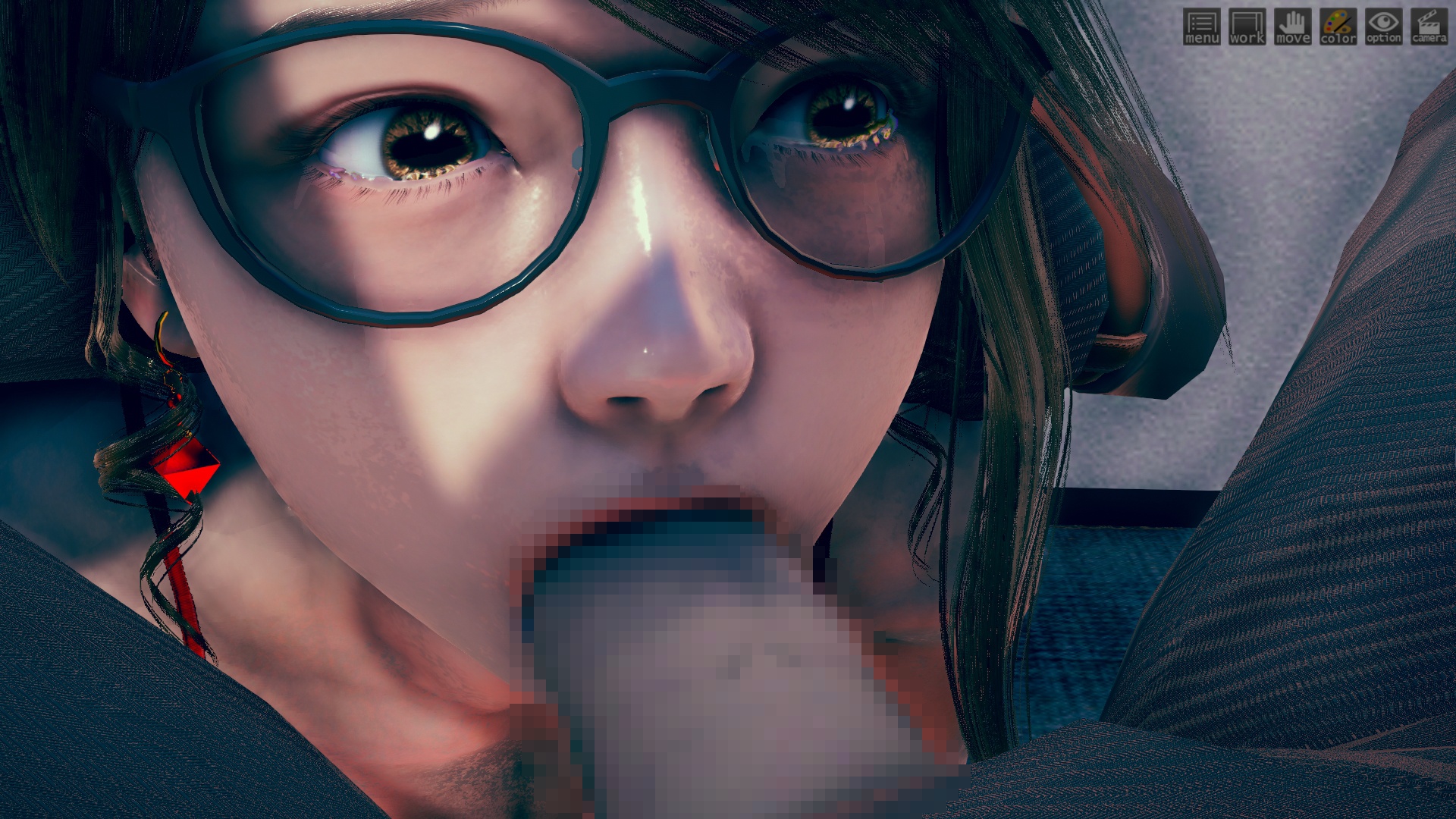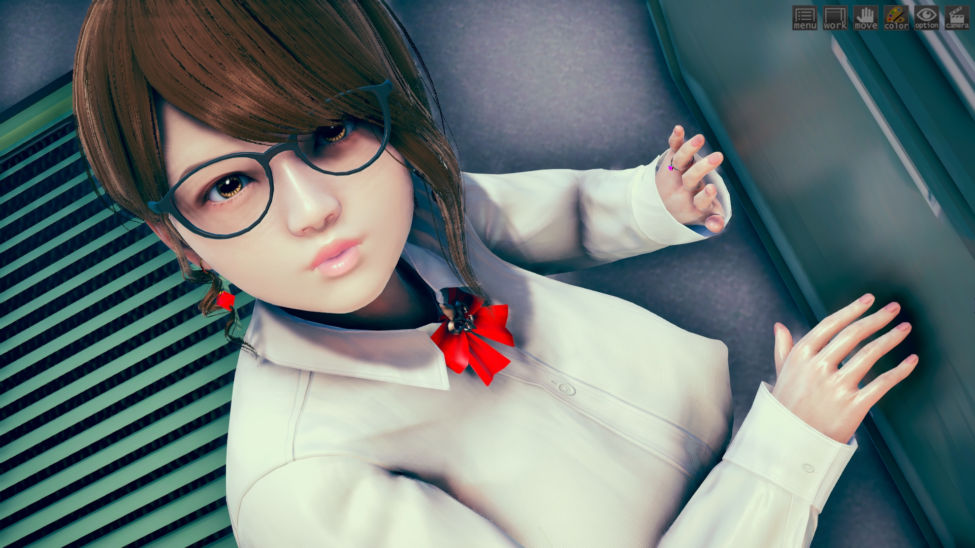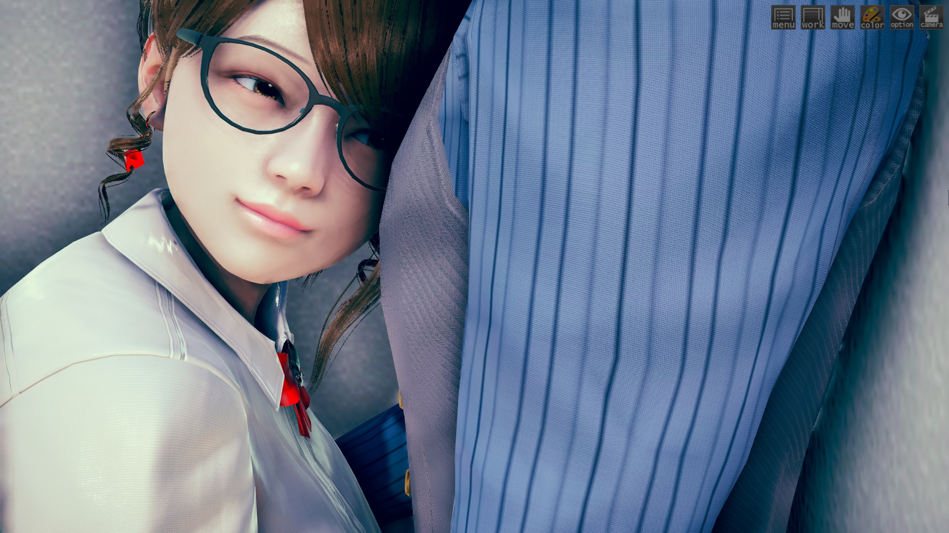 最初はhoohさんのlibrary map で作ってたんですけど、どうしてもライティングが決まらなくて。仕方なくオフィス舞台に変更。ファーストシーンで女性が床掃除してるのは、その名残り。このキャラもおれには珍しくオリジナルで、もちろんモデルは元同僚。これも奇跡的に似ていて最高。アイテムカメラなんでHボタン押すだけでサクサク進みます。全10場面でアイテムカメラ20ぐらい。
