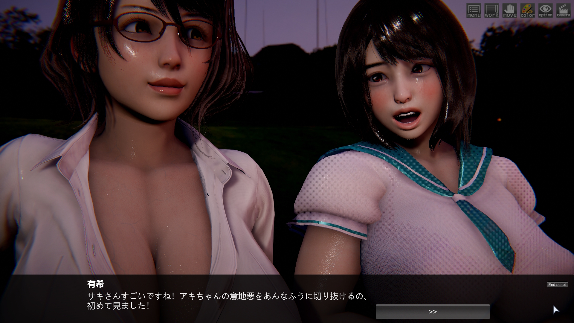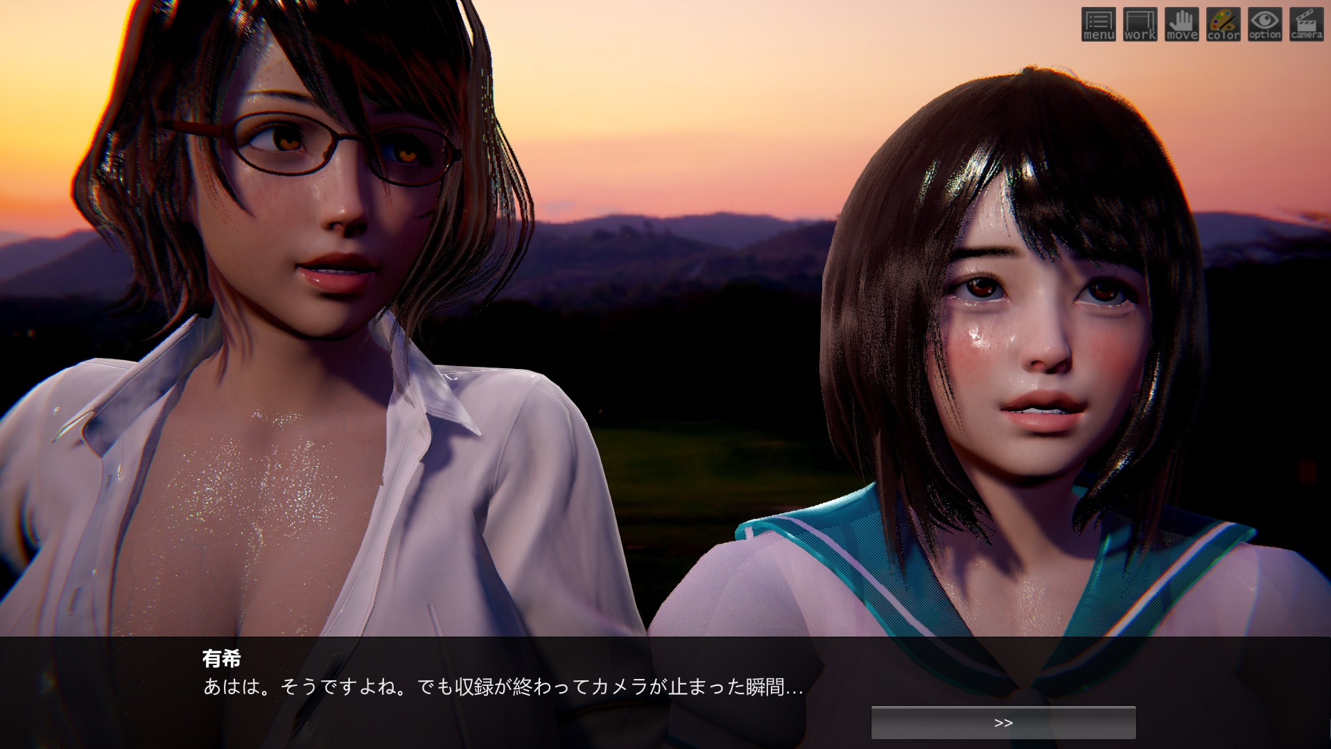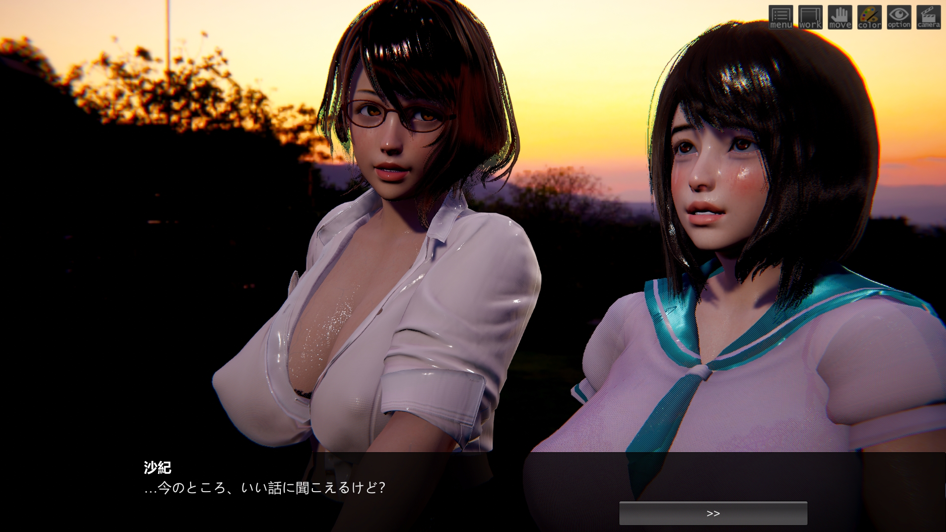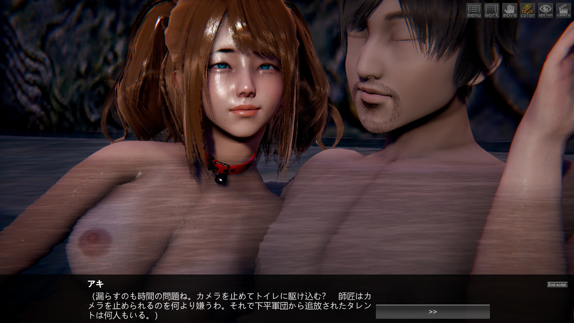 ・私の環境では、相変わらずsimple novelsとしてシーンをロードすると、graphicsの設定が一部ロードされない不具合が起きています。そのため、このシーン作成で使用したgraphicsの設定も同梱してあります。「美魔女5」フォルダ内にある「kan006(HDR).preset」を、graphicsの「Presets」フォルダにコピー。シーンの再生が始まってから(※ここ重要)、VNGEのメニューを呼び出し、「preset」から「kan005(HDR)」を選んでください。もちろんご自分のお好みの設定で鑑賞していただいても結構です。