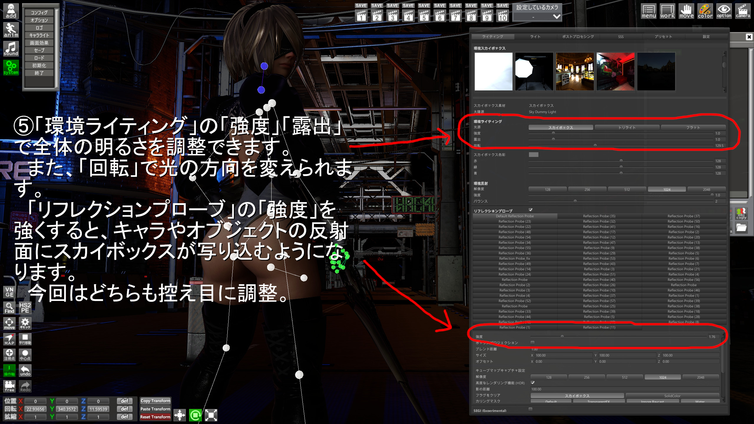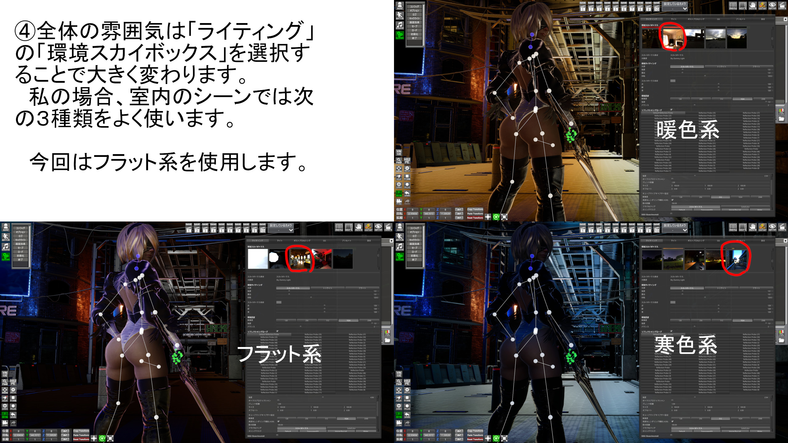 メインライト(カメラライト)以外にディレクションライトとポイントライトを1個ずつ追加したシンプルなライティングの実例です。工程の説明はギャラリーの画像をご覧ください。シーンデータとGraphicsプリセットをダウンロードできます。